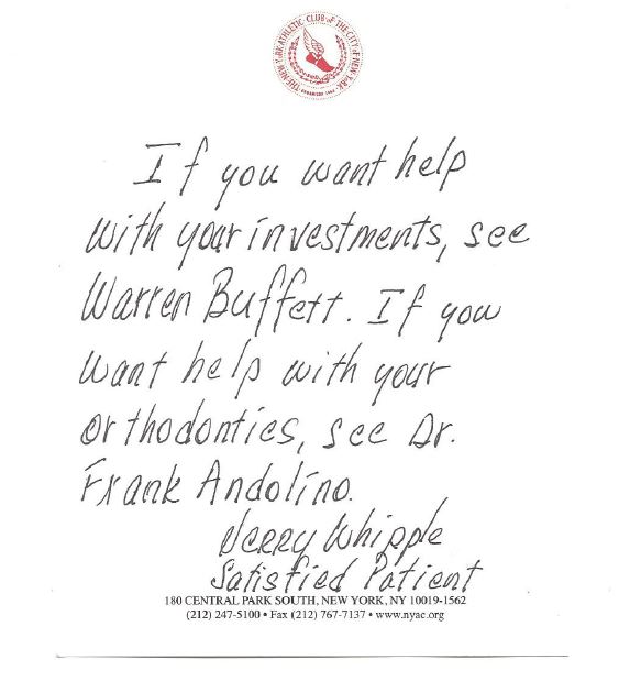 Notwithstanding that I wore braces as a child, when I moved to Manhattan nearly 40 years later, my new dentist told me if I didn't have braces my teeth would fall out! I was referred to Dr. Andolino's office and they were professional, kind and did an outstanding job on my teeth. I still have a wire on my lower teeth which doesn't show and more importantly, prevents my teeth from moving out of line. I also have a bruxism splint for TMJ which is fantastic and I can't sleep without it. Dr. Andolino is an extremely talented and dedicated orthodontist. In addition, he is actively involved in a program which provides free dental care to people in a third world country. He goes there to treat needy people as well as helps run the program through the government in that country. No punn intended, but he puts his money (and self) where his mouth is.  I greatly appreciate and admire Dr. Andolino's talent as well as the fact that he cares and gives back to others.